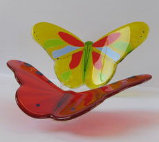 In versmolten glas in een variatie aan kleuren en groottes. De vlinders kunnen worden vastgezet op een granieten of RVS sokkel.